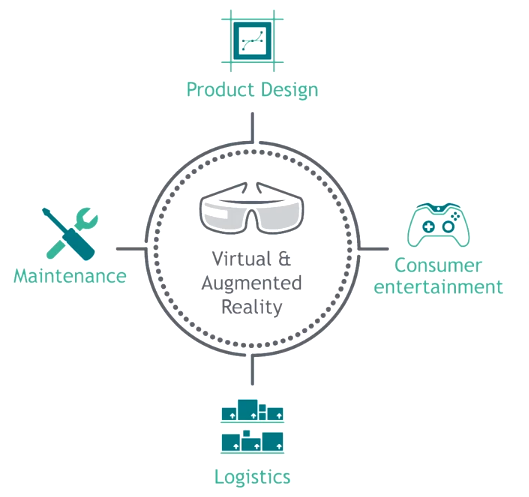 Thực tế ảo (VR - virtual reality) và thực tế tăng cường (AR - augmented reality) là những ví dụ khác về sự kết hợp công nghệ. Khả năng cảm biến, dữ liệu lớn và sức mạnh xử lý mạnh rất cần thiết. Kết hợp xu hướng này có tác động lâu dài chủ yếu tới giải trí tiêu dùng. Tuy nhiên, sự chuyển đổi mạnh mẽ sang AR đã thúc đẩy các ứng dụng kinh doanh mới trong lĩnh vực hậu cần, bảo trì và thiết kế sản phẩm. Công ty Echo Global Logistics chẳng hạn, đã cải thiện vận hành kho hàng qua hệ thống AR. Nhân viên lấy hàng của họ đeo thiết bị AR vào để tìm các tuyến đường phù hợp và chọn đúng mục hiệu quả hơn, từ đó tiết kiệm thời gian và giảm sai sót khi nhấc không đúng kiện hàng xuống 40%. Bạn có thể hình dung tương tự với việc bảo trì các máy móc công nghiệp khổng lồ nếu tuân thủ hướng dẫn AR từng bước. Người bảo trì có thể thấy rõ nơi cần tới, biết được thiết bị hay bộ phận nào bị thiếu, hiểu được nó sẽ lắp ráp với nhau thế nào và chỉ cần làm theo từng bước một.