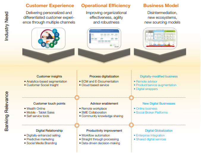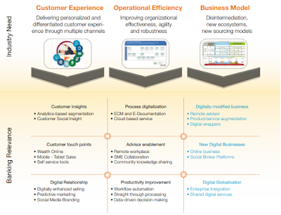 Để kết nối hai phần và trở thành ngân hàng số, có 3 mảng quan trọng cần chú ý là Ngân hàng của ngày hôm nay và ngày mai, Tối ưu hoá chi phí và thu nhập hay Thương mại hoá, các công nghệ chiều dọc và chiều ngang. Cụ thể hơn, 3 thách thức thường gặp với các CxOs là: