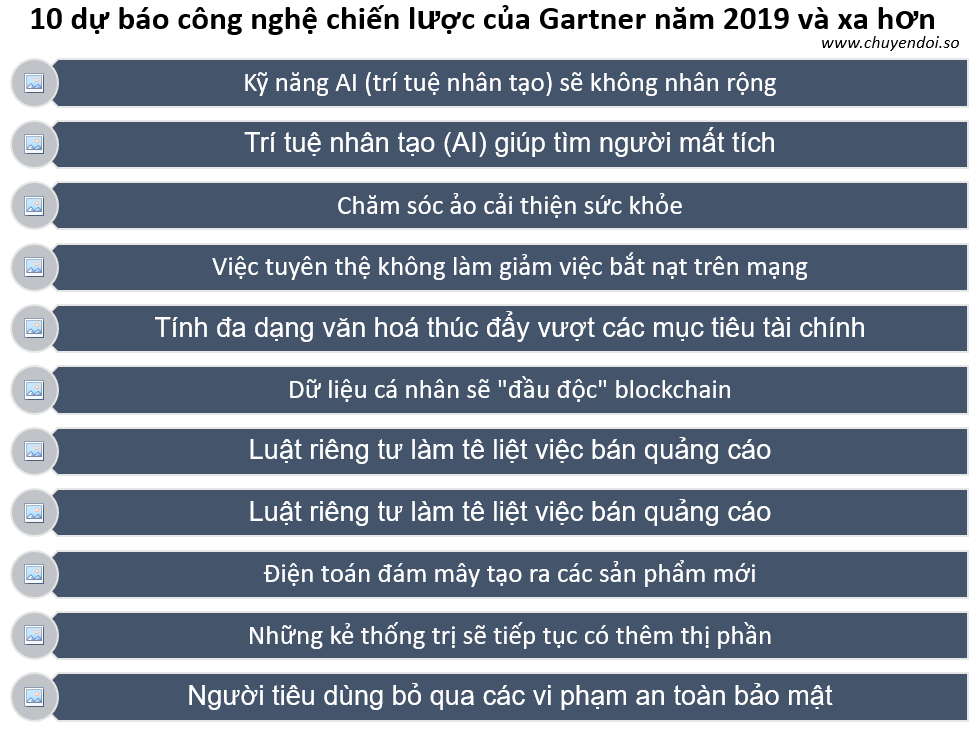 | 10 dự báo công nghệ chiến lược của Gartner 2019 và xa hơn (Gartner Strategic Predictions 2019 & beyond). Nguồn: Gartner |